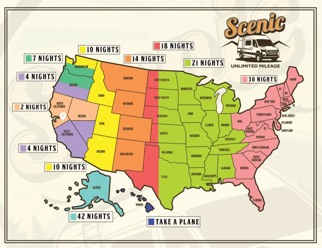 Scenic Campervans – 位於加州沙加緬度地區,非常適合長期租賃或在加州各地旅行使用。它們沒有每日里程限制,但根據目的地不同,會有最低租賃天數的要求。